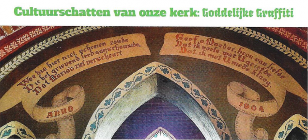 Eenmaal binnenin de kerk zie je tegen de galerij van de koorzolder de tekst; “Dominum in Chordis et Organi Ps CL Vs IV ” (Loof de Heer met gezang en orgelklanken, Psalmen 150.IV, vrij geïnterpreteerd).