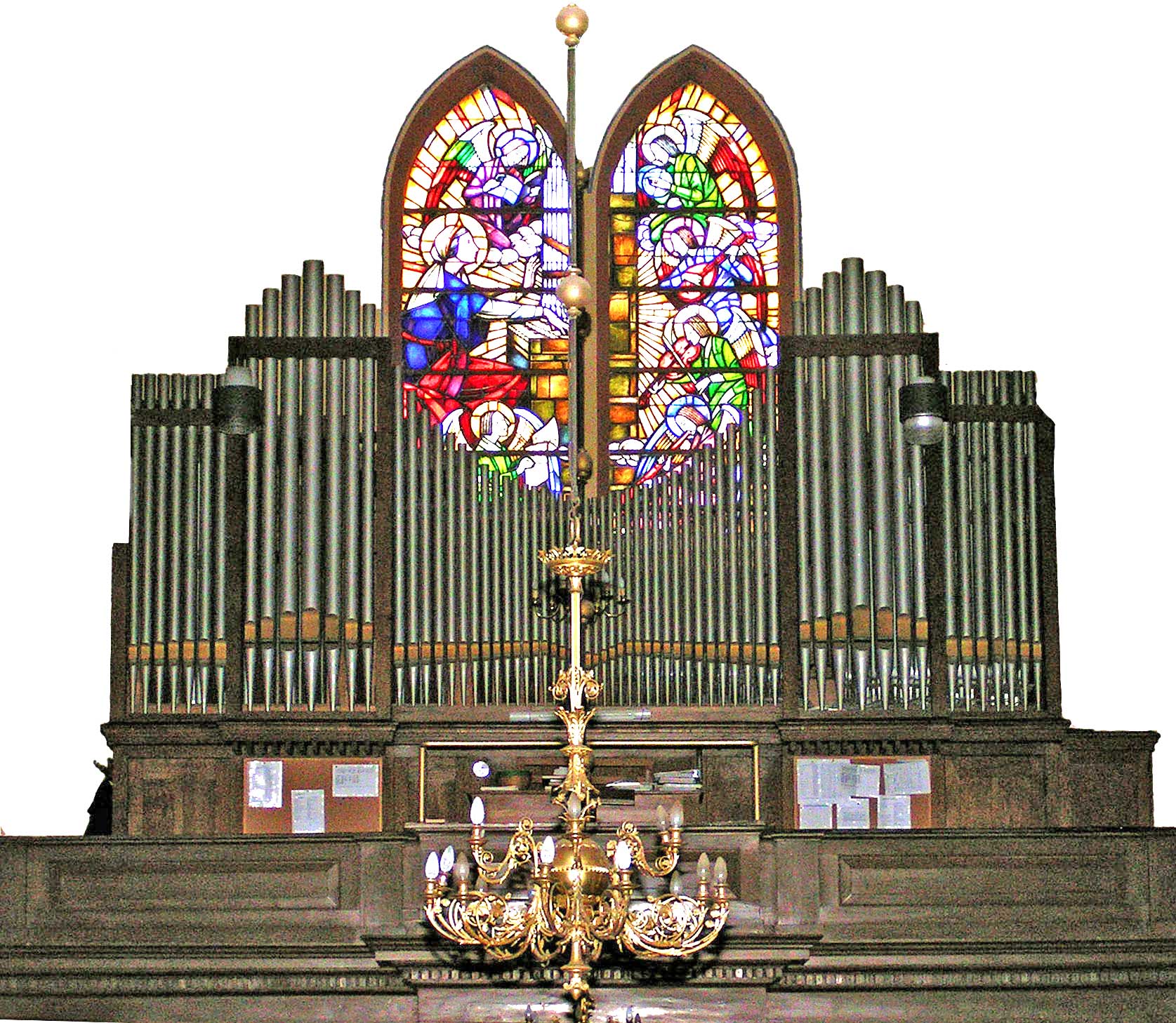 In de glas-in-loodramen achter het orgel zijn St. Caecilia en musicerende engelen afgebeeld.