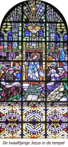 In de richting van het oksaal kijkend, ziet u in het raam links Jezus als 12-jarige jongen discussiëren te midden van de leraren in de tempel in Jeruzalem.