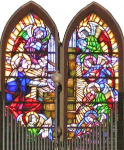 In de glas-in-loodramen achter het orgel zijn St. Caecilia en musicerende engelen afgebeeld.