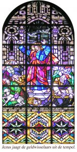 In het raam rechts van het oksaal ziet u dat Jezus de handelaren en geldwisselaars uit de tempel jaagt.