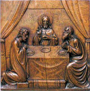 In het parochiezaaltje hebben onderstaande houten panelen gehangen, vermoedelijk afkomstig van de vroegere communiebank. Waar die panelen nu zijn, is onbekend.